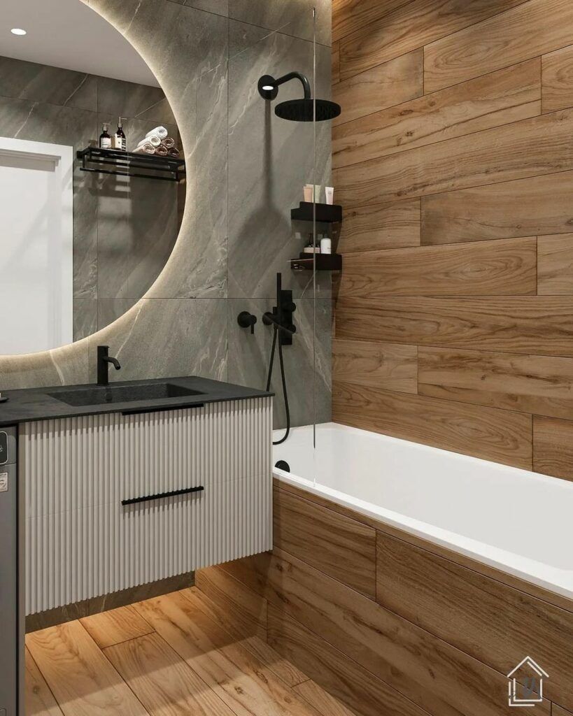 Бетон, используемый для пола или отдельных элементов, создает эффектный фон для теплого дерева. Мы также активно используем натуральные ткани – лен, хлопок, шерсть – для текстиля, подушек и обивки мебели, что подчеркивает экологичность и уют дома. Керамика и дерево прекрасно дополняют друг друга в ванных комнатах и кухнях, а натуральная кожа придает интерьеру роскошь и изысканность. Даже зеркала в деревянном интерьере могут быть использованы для расширения пространства и усиления естественного света, создавая интересные оптические эффекты;