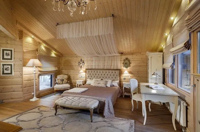 Русский Север: Этот стиль вдохновлен традиционными русскими избами, но переосмыслен в современном ключе. Мы видим массивные бревна, резные элементы, высокие кровли и обилие дерева как внутри, так и снаружи.